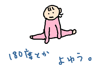 180度開脚とかよくやります。ていうか、180度超えてます。200度開脚とか。人間として大丈夫なのかしら。それとも、赤ちゃんってみんなこんなもの?
